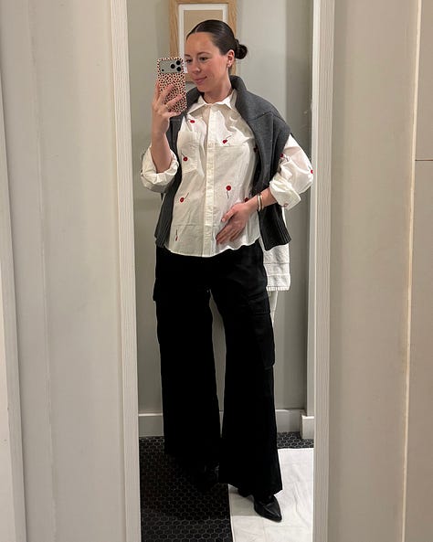 One of my go to pregnancy pants because of the pull on style. I dressed them up with a button down but you can also make an easy casual look with a tshirt, sweater and sneakers.